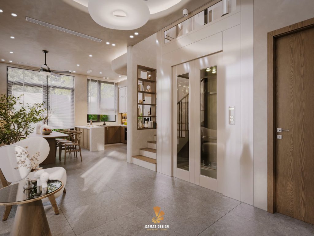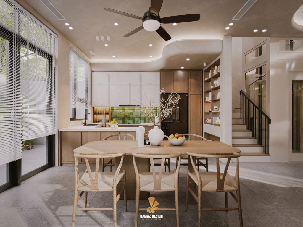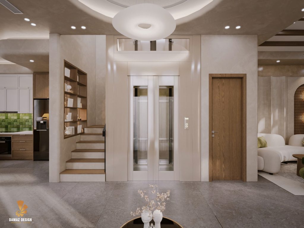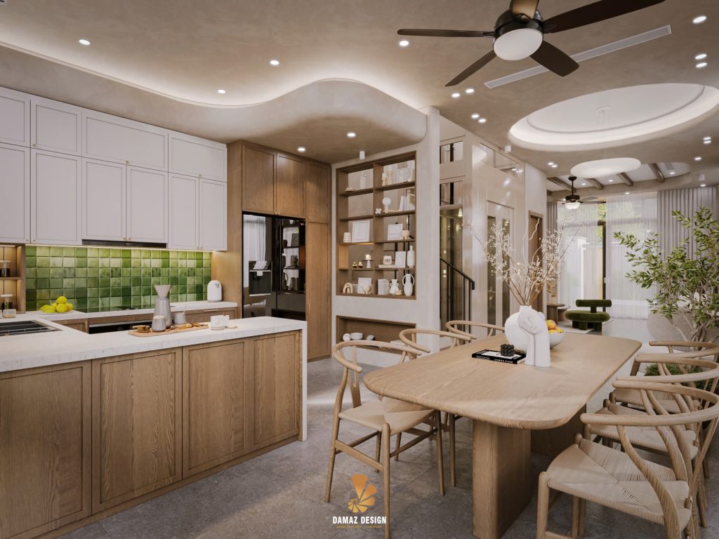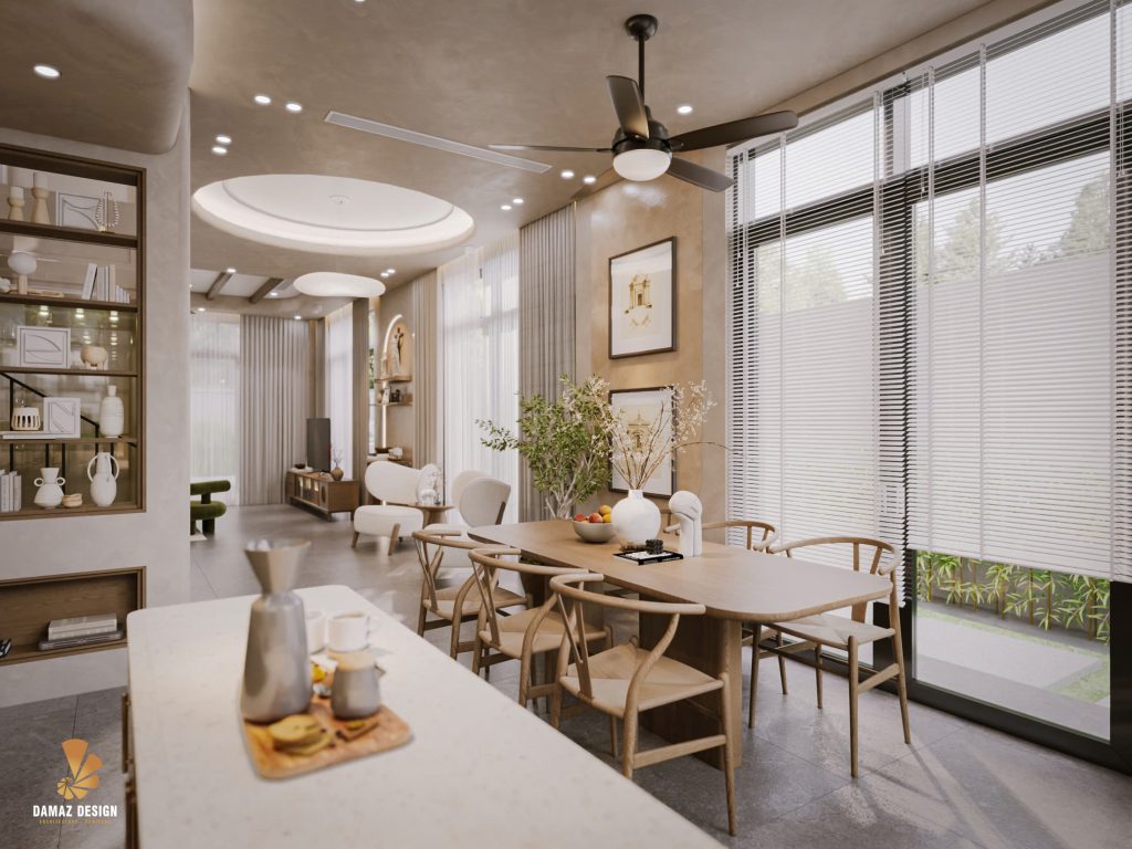 Với đường nét mềm mại và bảng màu trung tính tạo nên một bầu không khí ấm áp, thư thái ngay từ ánh nhìn đầu tiên. Trần nhà uốn cong theo dải ánh sáng khe dịu nhẹ, kết hợp các thanh xà gỗ trang trí, giúp tổng thể vừa hiện đại vừa mang hơi thở tự nhiên.