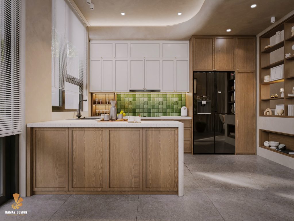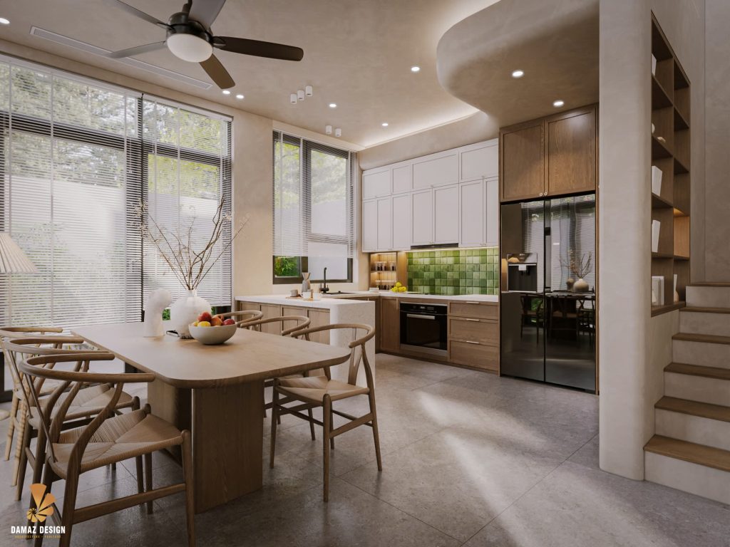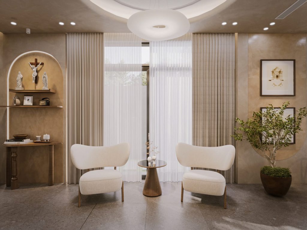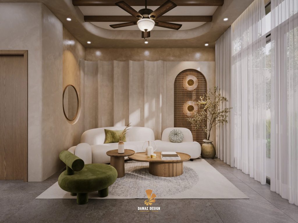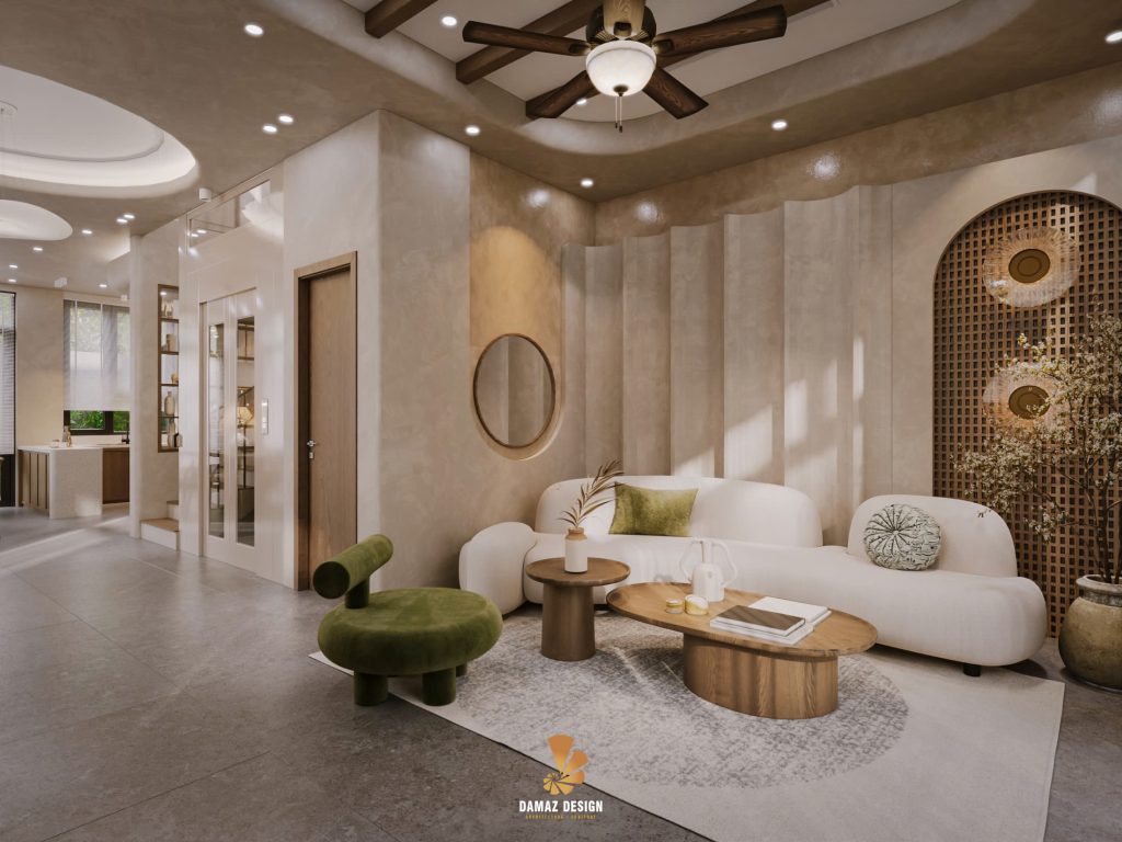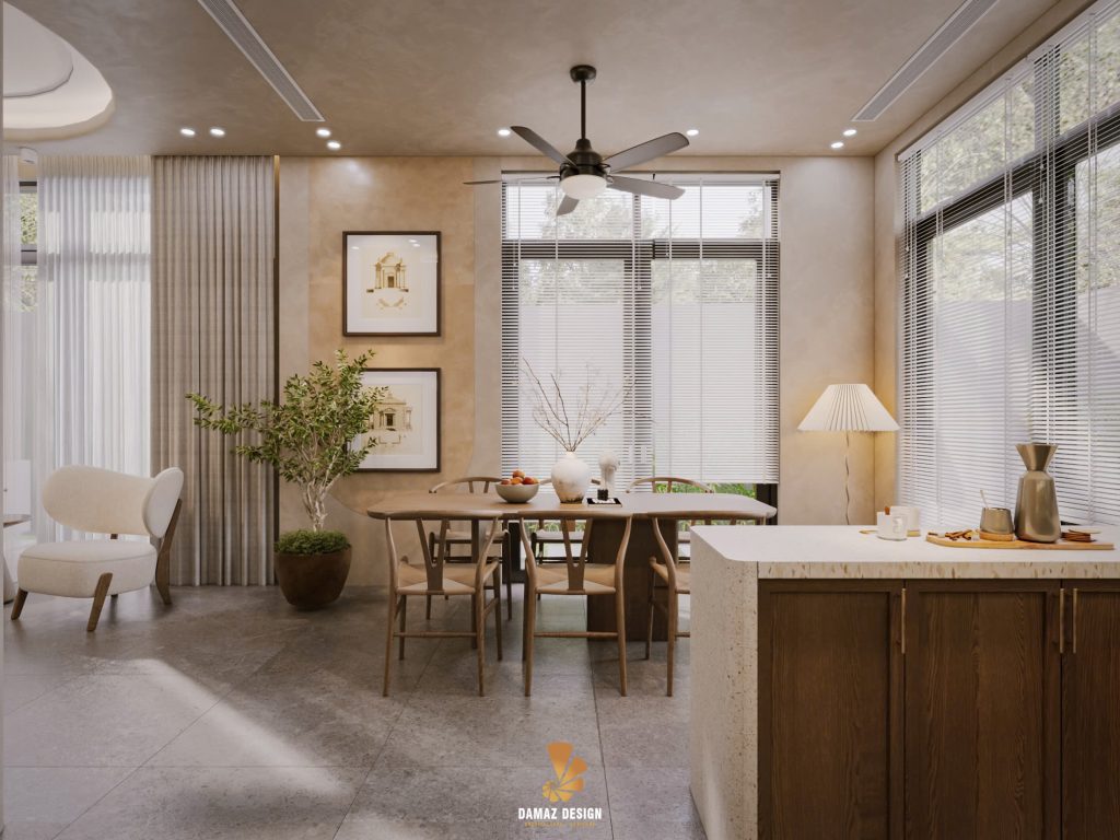 Với đường nét mềm mại và bảng màu trung tính tạo nên một bầu không khí ấm áp, thư thái ngay từ ánh nhìn đầu tiên. Trần nhà uốn cong theo dải ánh sáng khe dịu nhẹ, kết hợp các thanh xà gỗ trang trí, giúp tổng thể vừa hiện đại vừa mang hơi thở tự nhiên.